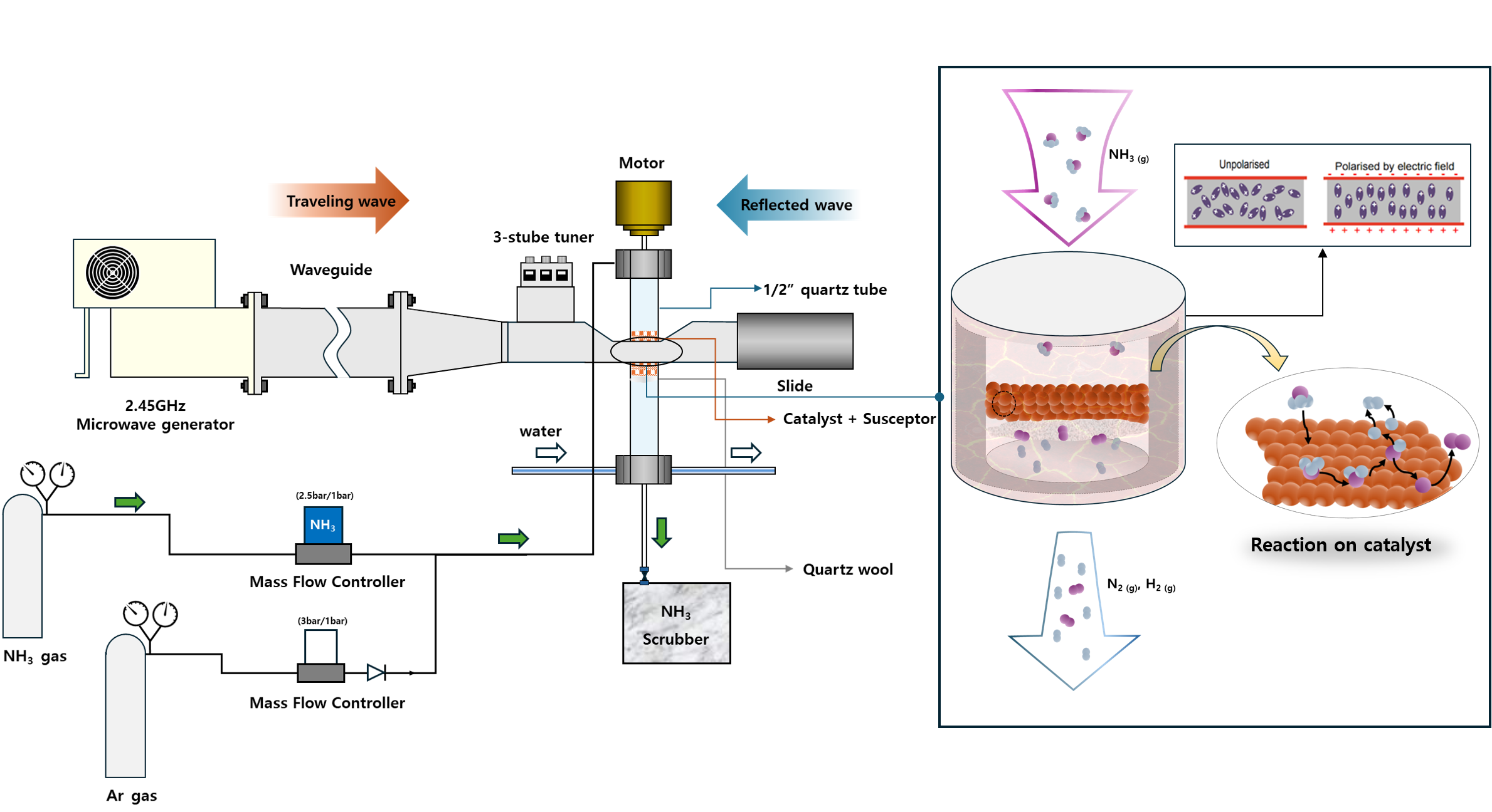 - Ammonia is a carbon-free hydrogen carrier that can be cracked into nitrogen and clean hydrogen without producing CO2 emissions. Our lab develops catalyst-based packed-bed reactors combined with microwave heating to achieve high-efficiency, CO2 -free hydrogen production from ammonia.By engineering catalyst shape (pellets, spheres, extrudates) and tuning active-metal dispersion, we optimize both microwave absorption (selective heating) and active-site accessibility.Microwave irradiation enables rapid heating rates and localized hot-spot formation, allowing precise control of ammonia conversion, hydrogen yield, and energy consumption compared to conventional furnace heating.Through real-time reaction monitoring and statistical design of experiments (DoE), we establish correlations among catalyst properties, microwave parameters, and process performance to derive scalable design guidelines for industrial hydrogen supply.