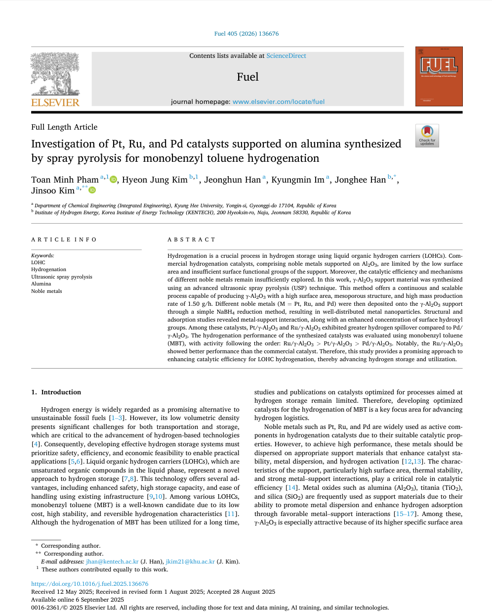 - Our research laboratory is dedicated to developing Liquid Organic Hydrogen Carrier (LOHC) technology to address the challenges posed by the variability of renewable energy sources and to establish reliable systems for energy storage and transportation. Renewable energy generation, particularly from solar and wind sources, often displays inconsistent production patterns influenced by temporal and geographic factors. Consequently, there is a pressing need for efficient energy storage solutions that can retain surplus electricity for future use. LOHC technology has emerged as a promising method for the safe and economical storage and transportation of hydrogen, particularly suitable for large-scale hydrogen logistics.The focal point of our research is the advancement of high-performance catalysts for the hydrogenation and dehydrogenation reactions associated with LOHC. While conventional catalysts are often utilized in powder form, the progression towards continuous hydrogenation and dehydrogenation systems necessitates the development of structured catalysts, such as beads or pellets. In addition, it is essential to reduce the accumulation of by-products to enhance catalyst longevity and tackle the critical issue of carbon deposition, which can lead to diminished performance. Through these initiatives, we aim to create robust catalysts with superior hydrogen selectivity and to establish efficient mass production methodologies for the commercialization of LOHC technology.
